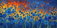Levendige blauwe bloemen steken af tegen een vurige gele en oranje achtergrond, die een contrast oproept tussen koele en warme kleuren. De wervelende patronen in de bloemen en de impressionistische stijl geven de scène een dromerige kwaliteit.