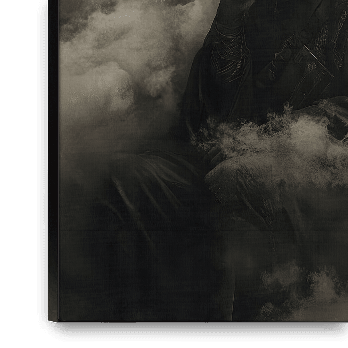 In een waas van mist en cryptische runen zit een verweerde krijger plechtig te mijmeren. Zijn harnas, versleten maar trots, vertelt verhalen van ontelbare gevechten die in stilte zijn uitgevochten. Schaduwen kleven aan zijn gezicht, geëtst met vuil en verdriet, terwijl zijn hand bij zijn lippen rust in een gebaar van diepe reflectie.…