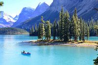 Terwijl we Spirit Island bewonderden in Maligne Lake, Alberta, Canada, kwam er een kleine kano naar ons toe. Het maakte het plaatje nog perfecter dan het al was.