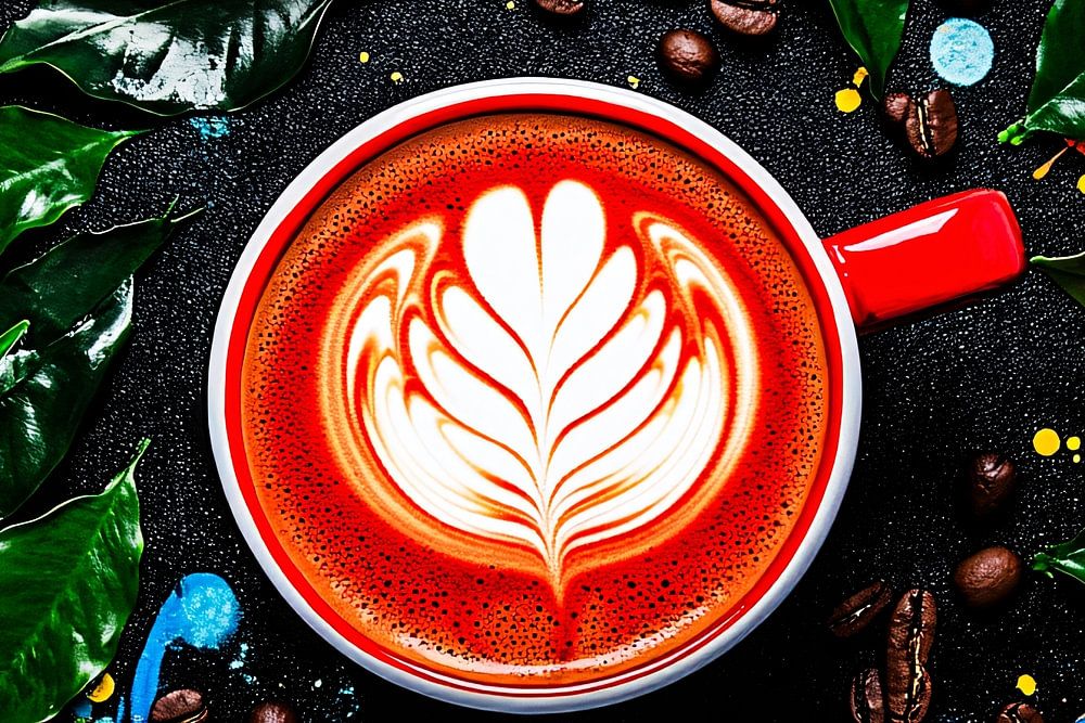 Dit unieke ontwerp combineert de schoonheid van latte art met een explosie van levendige kleuren. Een rode koffiemok met prachtige witte latte art in een bloemmotief springt eruit tegen een artistieke achtergrond vol kleurrijke spetters en groene bladeren. Het dynamische contrast tussen de zachte, organische vormen van de koffie en de speelse abstractie van de achtergrond maakt dit beeld een ware blikvanger. Perfect voor liefhebbers van koffie en kunst, of als decoratie om een energieke en inspirerende sfeer te creëren in elke ruimte.