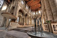 Het interieur van de Laurenskerk in Rotterdam met op de voorgrond het doopvont. Tegenwoordig kan de kerk worden gehuurd voor feesten en evenementen.