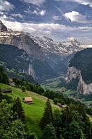 De diep ingesneden Lauterbrunnen vallei in het Berner Oberland in de Zwitserse Alpen. Op de achtergrond de 4.000 meter hoge toppen van de Jungfrau regio.