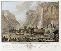 Lauterbrunnental, met Staubbach-watervallen en de kerk van Lauterbrunnen; Lauterbrunnen-vallei; Kleur kopergravure, 1784