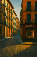 Lavapiés in Golden Light vangt de rustieke charme van de meest karakteristieke buurt van Madrid. Smalle geplaveide straten kronkelen door rijen okerkleurige en terracotta gevels waarvan de balkons worden geraakt door de zachte gloed van de ondergaande zon. Een enkele tapasbar gloeit uitnodigend op de hoek, zijn warme binnenverlichting…