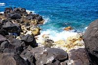 Lavarotsen in de blauwe oceaan op de Azoren. Een enorme hoeveelheid van lavasteen is in de Atlantische Oceaan geduwd na een vulkaanuitbarsting.