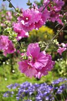 Roze, blauwe en groene kleuren in een zonnige, zomer tuin. Bloeiende Lavatera struik en bloeiende Agapanthus. Mooi als tuinposter.