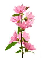 Een foto van bloeiende Lavatera. De grote roze bloemen komen prachtig uit tegen de witte achtergrond.