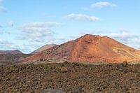 Koop dit landschapskunstwerk Lavavaveld en rode berg op de achtergrond op Lanzarote van Reiner Conrad op canvas, aluminium dibond, (ingelijste) fotoprint, behang en ArtFrame, op maat geprint in Fine-Art kwaliteit.