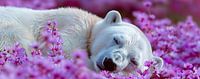 De ijsbeer ligt ontspannen, met zijn ogen dicht en een kalme uitdrukking op zijn gezicht, terwijl de delicate bloesems hem omringen. De contrasterende kleuren van de witte vacht van de beer en de paarse…
