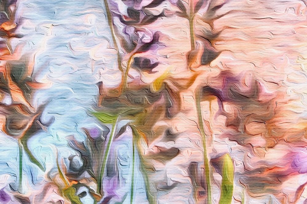 Lavendelbloesems tegen een pastelkleurige achtergrond met zachte penseelstreken. Delicaat lavendelpalet en een romantische Provençaalse sfeer.