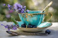 Elegant turquoise theekopje met gouden rand, omringd door lavendel en blauwe bessen. Subtiel diffuus licht en mysterieuze tuinachtergrond creëren een romantische, dromerige sfeer. Dit werk sluit naadloos aan bij de collectie “Romantische en Dromerige Stillevens – Mysterieuze Eleganties” en verfraait keuken, eetkamer of woonkamer in pastelkleuren.