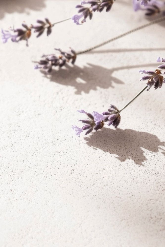 Delicate lavendelstengels spreiden zich zachtjes uit over een lichtgekleurd, subtiel gestructureerd oppervlak en creëren een kalme, harmonieuze sfeer. Hun subtiele schaduwen spreken van lichtheid en frisheid. Dit stijlvolle arrangement is perfect voor de slaapkamer, waar het een ontspannen oase van rust kan creëren.