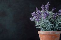 Een vleugje Provence spreidt zich uit, terwijl delicate lavendelbloemen bloeien in zachte paarse tinten en de rustieke aardewerken pot het beeld harmonieus afrondt. Deze compositie geeft een gevoel van rust en frisheid aan elke kamer en is perfect voor de keuken of woonkamer om een uitnodigende sfeer te creëren.