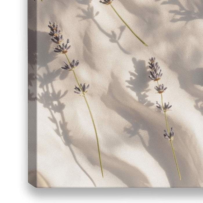 Delicate lavendelbloesems dansen over zachte, golvende schaduwen, terwijl de zachte kleuren een ontspannende, uitnodigende sfeer creëren. Dit harmonieuze samenspel van natuur en licht brengt rust en frisheid in elke slaapkamer. Perfect om een sfeer van sereniteit en welzijn te creëren.