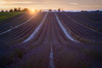 De lavendelstruiken, netjes gerangschikt in rijen, creëren een levendig schouwspel van kleur en geur. De paarse bloemen strekken zich uit tot aan de horizon, als een zee van pure sereniteit. De zonsondergang zorgt voor een extra dimensie, waarbij de schaduwen langer worden en de kleuren intenser lijken. Het contrast tussen het levendige paars van de lavendel en de warme gloed van de ondergaande zon zorgt voor een betoverend visueel spektakel.