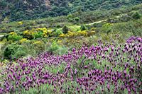 Bloemenvelden van paarse wilde lavendel (lavender field) en gele wilde brem, een waar kleurenpalet in de bergen van Extremadura, Spanje. Ondanks de droogte komt er in de lente een prachtig bloementapijt met uitbundig geurende en bloeiende bloemen tevoorschijn. In de Extremadura leven veel verschillende soorten vogels, een waar paradijs…