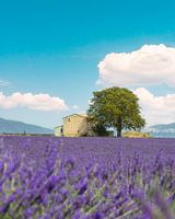 Lavendelveld, een huis en een boom. Wazige lavendel op de voorgrond. Plateau van Valensole, Provence, Frankrijk, Europa