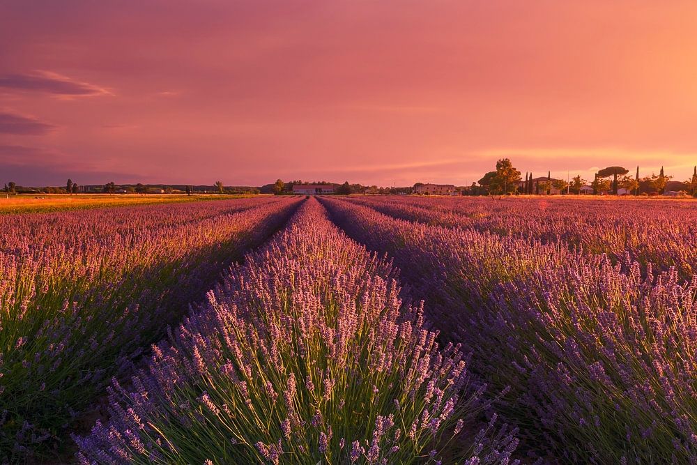 Lavendelbloemenveld en een prachtige zonsondergang. Marina di Cecina, provincie Livorno, regio Toscane, Italië