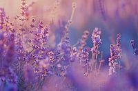 Deze prachtige afbeelding toont een veld vol met lavendel, badend in het zachte licht van de zonsondergang. De diepe paarse en levendige roze tinten van de bloemen contrasteren mooi met de subtiele groene kleur van de bladeren. Deze foto zou perfect passen in elke ruimte die een vleugje rust en natuurlijke schoonheid nodig heeft, van de woonkamer tot de slaapkamer. Het is een ideaal decorstuk voor liefhebbers van natuur en bloemen, en brengt een stukje van de rustgevende buitenwereld naar binnen.