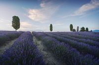 Lavendelvelden en bomen bij zonsondergang. Orciano Pisano, provincie Pisa, regio Toscane, Italië, Europa