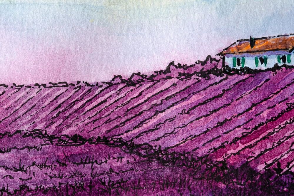 In dit geval wilde ik een Lavendel heuvellandschap schilderen met een Toscaanse uitstraling. In de compositie staat een Toscaans landhuis op de paarse heuvel. Het landhuis is op scherpe wijze geïllustreerd en speelt samen met het Lavendel de hoofdrol.