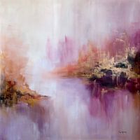 ‘Lavender Haze’ is een dromerig abstract landschap waarin lila, zachte roze en paase tinten en warme aardekleuren in elkaar overvloeien. Transparante lagen zorgen ervoor dat licht en kleur elkaar subtiel raken en weer loslaten. In het werk zijn verfijnde details van goud en brons te ontdekken, soms duidelijk zichtbaar, soms bijna…