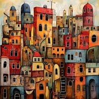 Een stad opgebouwd uit lagen van kleur en vorm. Warme tinten en speelse architectuur smelten samen tot een expressief stadsbeeld vol ritme en karakter.