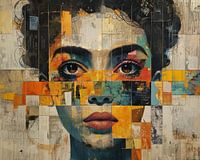 Layers of Expression - Dit vrouwen schilderij toont een opvallend en expressief vrouwelijk gezicht in een collage van verschillende texturen en kleuren, samengesteld in een mozaïek van rechthoekige panelen met variërende breedtes en hoogtes. Het gezicht is krachtig en gedetailleerd weergegeven met diepe, doordringende ogen die de beschouwer rechtstreeks aankijken. De huidtonen variëren van aardetinten tot levendige oranje en blauwe accenten die speelsheid en dynamiek toevoegen aan de anders gestructureerde opzet. De lippen zijn weelderig en rozerood, contrasterend met de subtielere tinten van de achtergrond. Tekstfragmenten en abstracte patronen onderbreken en overlappen het gezicht op sommige plaatsen, waardoor een gelaagd en multidimensionaal effect ontstaat. Dit is een modern portret, waarin traditionele portretschilderkunst wordt vermengd met hedendaagse abstracte en grafische elementen, waardoor het een fascinerend visueel spektakel wordt voor de kijker.