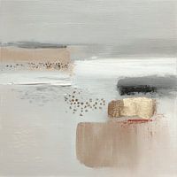Een rustig en stijlvol werk met zachte aardetinten en verfijnde textuurdetails. De lagen beige, gebroken wit en lichtgrijs vormen een kalme basis, terwijl het gouden accent zorgt voor een subtiele, warme glans. De penseelstreken zijn bewust en vertraagd, waardoor het werk een gevoel van rust en ruimte oproept.