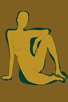 Grafische tekening van een model in geel en paars.