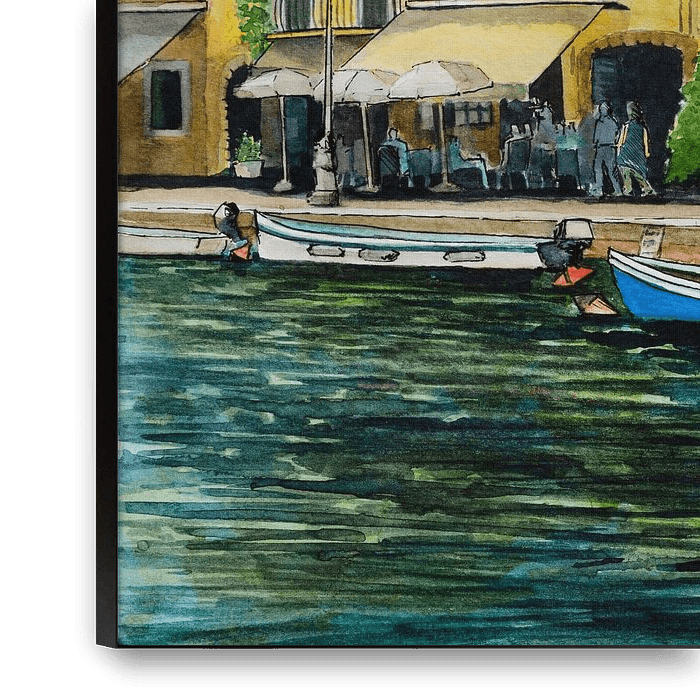 Koop dit schilderij Lazise vissershaven | Gardameer Italie | Aquarel schilderij van WatercolorWall als reproductie op canvas, aluminium dibond, (ingelijste) fotoprint, behang en ArtFrame, op maat geprint in Fine-Art kwaliteit.