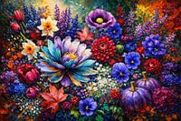 Het kunstwerk toont een overvloed aan bloemen, waaronder tulpen, dahlia's, klaprozen en viooltjes, gecombineerd met herfstbladeren en paarse pompoenen.