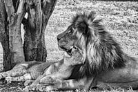 Lui leeuwenwelp hangt tegen vader aan in de schaduw