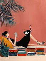 Lazy Sundays With My Cat is een warm en sfeervol kunstwerk dat de rust van een kalm moment perfect vangt. Een elegante vrouw leest ontspannen op een zachte bank, omringd door kleurige stapels boeken, tropische planten en een nieuwsgierige kat die zich tegen haar aan nestelt. De terracotta achtergrond, moderne vormen en zachte…