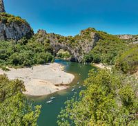 Le Pont d’Arc over de rivier de Ardèche, Vallon-Pont-d’Arc, Ardèche, Frankrijk, , landschap, water, bomen, zomer, strand, mensen, kano