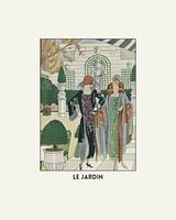 Een historische mode prent in een modern jasje: "Le jardin". Geïnspireerd door de Art Deco, een stijlbeweging die opkwam in de jaren twintig van de vorige eeuw. Nieuw zakelijkheid gemengd met moderne strakke lijnen en kleuren.