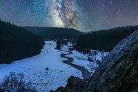 Een compositie beeld van een sneeuwlandschap in Elsenborn, omgezet in een nachtbeeld, met een melkwegfoto.