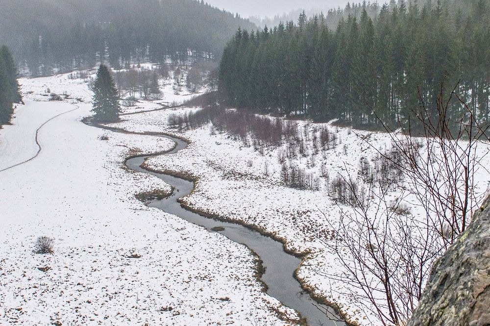 Een mistige dag bij le rocher du Bieley, een rots met uitzicht op een kronkelende rivier in de Oostkantons van België