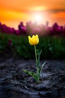 A beautiful yellow tulip standing alone in front of rows of purple tulips at sunset.