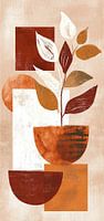 Leaf Harmony - Dit botanische schilderij toont een prachtige plant met bladeren in warme tinten, geplaatst tegen een achtergrond van abstracte geometrische vormen in aardetinten, waardoor het een moderne uitstraling krijgt die perfect is voor elk interieur.