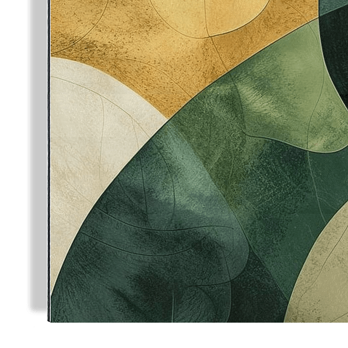Leaf Whispers - Dit abstracte bladeren schilderij toont een intrigerende compositie van organische vormen en lijnen die de essentie van bladeren en natuurlijke elementen nabootsen, samengevoegd in een harmonieuze abstracte expressie. De hoofdelementen zijn gestileerde bladeren, uitgevoerd in verschillende kleurschakeringen van groen,…