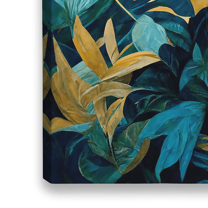 Een weelderig palet van tropische gebladerte, waaronder Monstera dilliciosa. Levendige compositie van blauw, groen en oker tinten. Botanical brilliance.