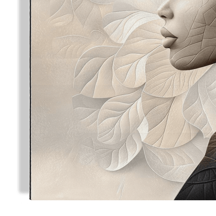 Surrealistisch profiel portret van een vrouw versierd met bloemblaadjes in naturel tinten met taupe en zwart in een gelaagd 3d effect.