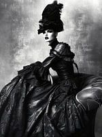 Fantasie portret van vrouw in een jurk van kant en leder met een grote kanten hoed.