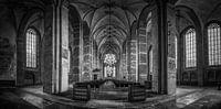 Een zwart wit panorama van de binnenkant van de Grote of Lebuïnus kerk in Deventer.