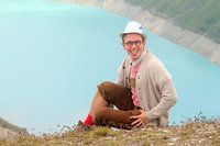 Prachtige opname van de een jongeman in traditionele kleding met lederhose in de Zwitserse Alpen nabij Grimentz in de Val d'Anniviers vallei in het kanton Wallis in Zwitserland in de zomer met turquoise stuwmeer Lac de Moiry in de achtergrond