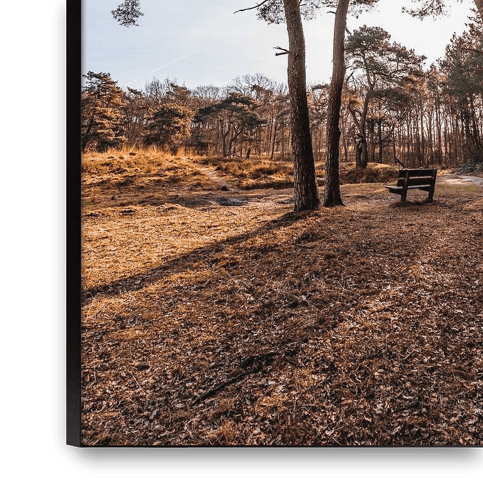 Koop de foto Leeg bankje in het bos van Dafne Vos op canvas, aluminium dibond, (ingelijste) fotoprint, behang en ArtFrame, op maat geprint in Fine-Art kwaliteit.