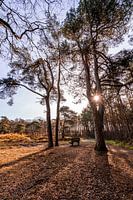 Leeg bankje midden in het bos met de zon die tussen één van de bomen door schijnt. Woldberg, Overrijssel in Nederland. De foto is genomen in de herfst, dit zie je terug aan de oranje/bruine bladeren op de grond en de kale bomen.