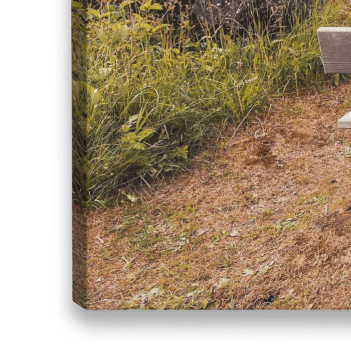 Landschapsfoto van een uitzichtpunt vanaf een bergtop waar een houten bankje bovenop staat. Hier kun je heerlijk zitten, genieten van de natuur in stilte en rustig nadenken over het leven. Aan de voorkant zijn de groen begroeide bergen. In de verte de rotsachtige besneeuwde bergen. De foto is genomen in Davos, Graubünden in Zwitserland.