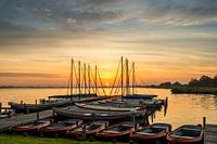 Een kleurrijke zonsopkomst aan het Leekstermeer vanaf vakantiepark Cnossen. De zeilboten en de roeiboten liggen aan de steiger. De zon piept tussen de masten door als deze net boven de horizon uit komt.